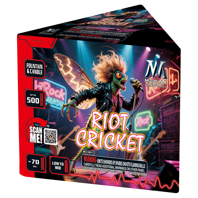 RIOT CRICKET begins with 3 times of GIANT INSTANT white strobe dazzles , then silver fountain red green stars with big crackling, here comes the climax of powerful mine effect with red/green/blue stars and crackling.
